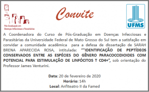 Defesa de Dissertação de SARAH BRENA APARECIDA ROSA, intitulada: “IDENTIFICAÇÃO DE PEPTÍDEOS CONSERVADOS ENTRE AS ESPÉCIES DO GÊNERO PARACOCCIDIOIDES COM POTENCIAL PARA ESTIMULAÇÃO DE LINFÓCITOS T CD4+”sob orientação do Professor James Venturini.