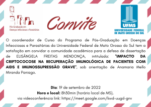 Defesa de Dissertação de ELISÂNGELA FREITAS MENDONÇA, intitulada:IMPACTO DA CRIPTOCOCOSE NA RECUPERAÇÃO IMUNOLÓGICA DE PACIENTES COM AIDS E IMUNOSSUPRESSÃO GRAVE”sob orientação da Professora Anamaria Mello Miranda Paniago.