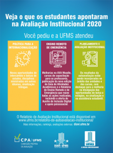 O questionário está mais curto, ou seja, com número menor de questões. Para acessar digite: (https://siai.ufms.br/avaliacao-institucional/). Não é necessário responder todas as questões de uma única vez, ou seja, é possível responder por grupos, gerando um código pessoal, que permite retorno, se necessário. O anonimato é garantido. As informações coletadas serão utilizadas na elaboração do Relatório de Autoavaliação.